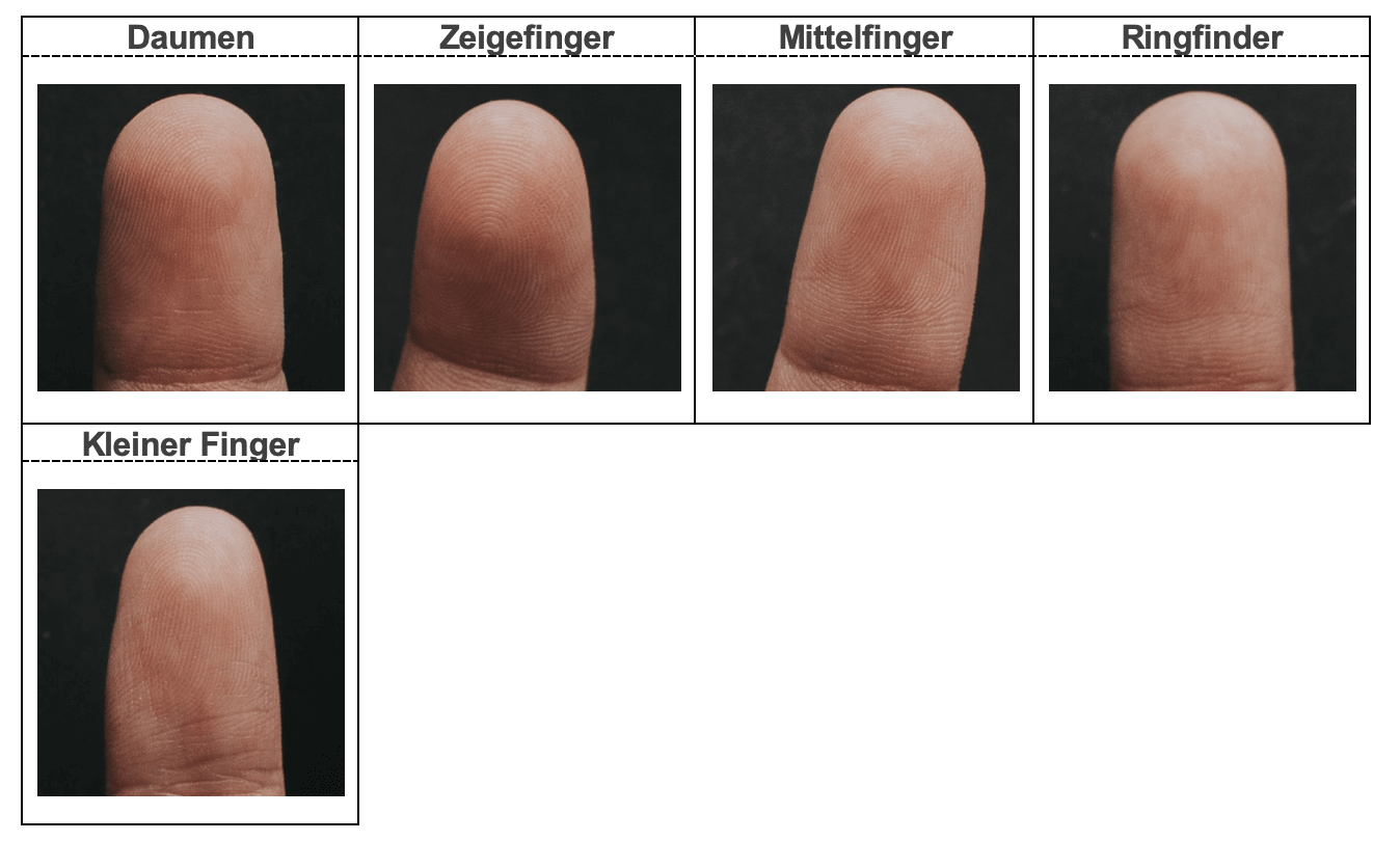 - Es ist wichtig zu markieren, zu welchem Finger der jeweilige Fingerabdruck gehört. Dafür bist du selbst verantwortlich und nur dann kann ich eine richtige Dekodierung gewährleisten.