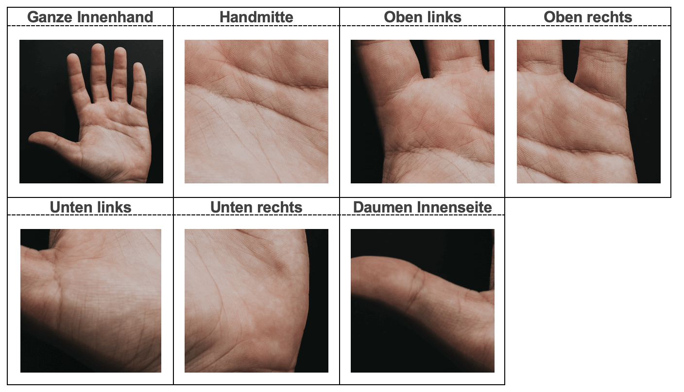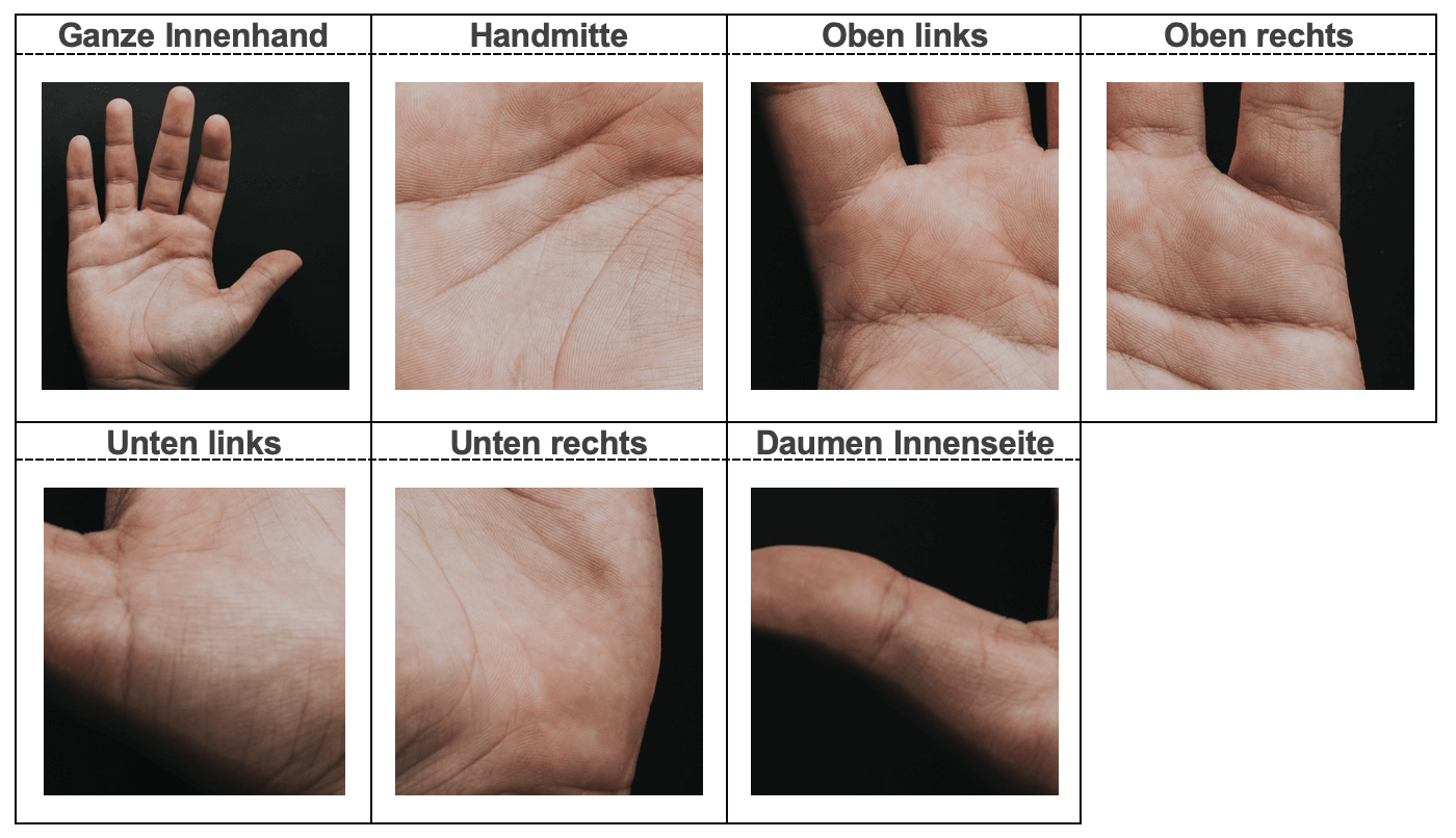 - Zusätzlich zu den Fingerabdrücken benötige ich 14 Bilder (rechte und linke Hand) von verschiedenen Teilen deiner Hand
